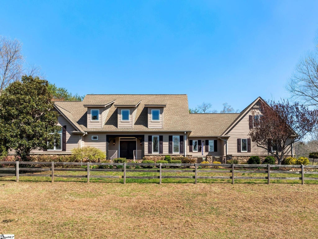 Charming farm on 5.4 acres in Landrum's Gowen's Fort gated community. The main level primary suite features a gas fireplace, dual vanities, jacuzzi tub walk in tile shower, double closets and triple doors leading to a screen lanai -- a serene year-round retreat. Upstairs included two en-suite bedrooms, a dedicated flex/office space and a finished bonus room above the garage --ideal for guests, multi-gen living, remote work, or recreation. An open concept kitchen and living room anchors the home, where smart-enabled appliances deliver real-time alerts directly to the 75" TV. Soaring ceilings and a stunning double sided stone fireplace elevate both the living room and the adjacent dining space. Built-in surround sound throughout the home enriches the atmosphere for entertainment and relaxation. The 4-stall barn includes hay storage, fenced pastures, and a fully independent efficiency apartment with kitchen, full bath, and a private stone patio and fireplace --suitable for guests, caretakers, or income potential. This property offers the perfect set up for up to 4 horses, with direct access to community trails. 22 miles to TIEC and 34 miles to GSP