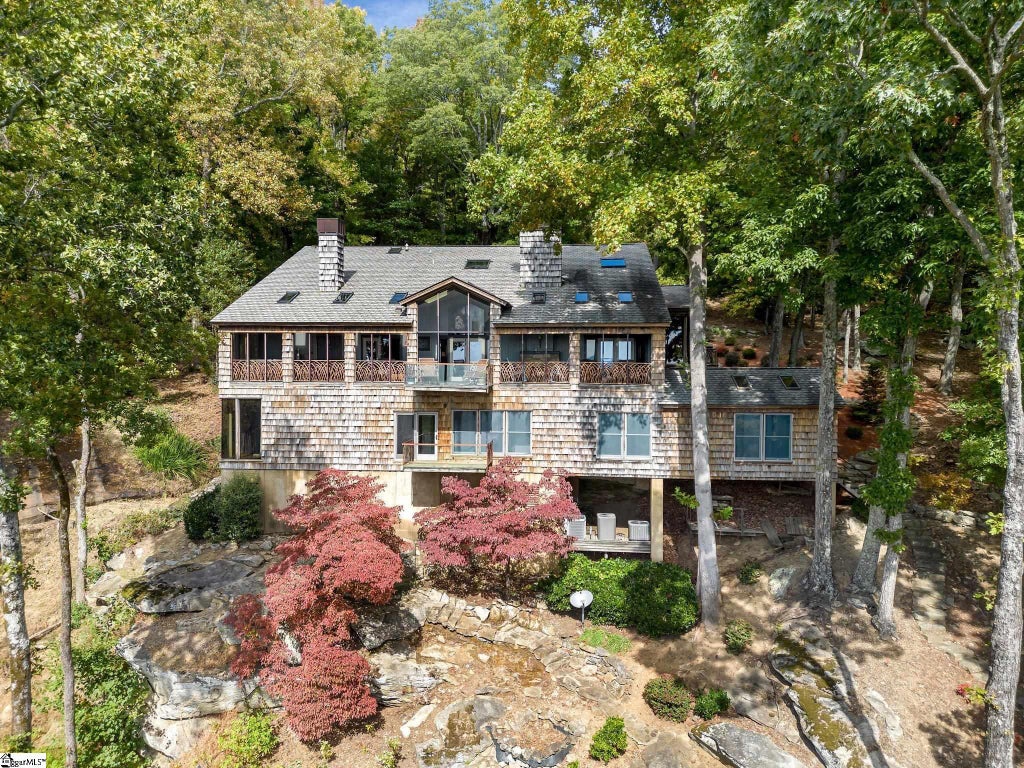 Nestled within The Cliffs at Glassy, this extraordinary estate spans over five acres, seamlessly blending refined architecture with the natural beauty of its surroundings. Thoughtfully designed to embrace the landscape—including a striking natural waterfall—this one-of-a-kind home is a sanctuary of artistry & elegance. A sense of wonder greets you upon arrival. A custom bridge, adorned with metalwork by acclaimed artist-blacksmith John Boyd Smith, spans a water feature, guiding you to the entrance. There a handcrafted copper door—framed by locally made stained-glass transoms—invites you in where craftsmanship, design, & nature exist in perfect harmony. Step into this Frank Lloyd Wright-inspired masterpiece & discover a symphony of design & natural light that highlights the home’s organic elegance. The entryway opens to a breathtaking, panoramic view of Paris Mountain. At the heart of the home, the great room features a stone gas fireplace, an indoor 9’ recirculating water wall & sealed slate floors. Just beyond, a spacious deck, with custom-forged metal railings, invites seamless indoor-outdoor living. A handcrafted light fixture, artfully designed to reflect the leaf of every type of tree found on the property, serves as a natural conversation piece. Whether gathered around the wood-burning fireplace or gazing off one of the four balconies, you’ll find endless opportunities to unwind & take in the serene beauty of Glassy Mountain. At the heart of the home, the custom-designed gourmet kitchen caters to culinary enthusiasts with high-end appliances, including a Viking range with double ovens, Sub-Zero refrigerator, two dishwashers, a warming drawer, a wine chiller, an ice machine, & three sinks. A butcher block countertop with built-in bread-cutting station adding both function & charm, compliments the surrounding granite countertops. Blending rustic character with contemporary style, a raised beveled glass bar & a copper-finished serving counter introduce artistic flair. An updated walk-in butler’s pantry—with additional cabinetry & a full size freezer—provides ample storage space. Adding to the charm of this exceptional kitchen is one of the home’s four gas fireplaces. Just off the kitchen, the cozy breakfast room offers a built-in Bosch coffee station & sweeping views of mountains, making every morning a serene experience. The primary bedroom features a cathedral ceiling, gas fireplace, & bamboo-striated floors. It seamlessly connects to the keeping room with a private balcony, currently used as a home office, framing the landscape of Paris Mountain & the natural waterfall. A walk-in closet with stacked washer/dryer leads to a private workspace above via a spiral staircase. The primary bath is a spa-like sanctuary with Kohler glass vessel sinks, soaking tub, & makeup vanity. The lower level features two spacious en-suite bedrooms, one with views of the waterfall. Bathrooms include frameless glass showers, heated tile floors, a sauna, & a private water closet. A theater/recreation room with cedar ceilings & skylights offers the perfect space for entertaining, alongside a fully equipped wet bar & a wine cellar with cork flooring, dual chillers, & room for 250 bottles. The theater includes a 110-inch screen, built-in bookcases, & custom media cabinets. Above the garage, a secluded guest suite offers versatile space—perfect for visitors, recreation, or hobbies. Thoughtful upgrades include new lighting along the driveway and east side path along the house, multiple redesigned storage spaces, high-end appliances, new lighting & ceiling fans, fresh paint, & smart switches & thermostats integrated with Alexa for voice control. This estate is a rare blend of natural beauty & artistic vision—a sanctuary that inspires creativity, nurtures tranquility, & celebrates the art of living in harmony with the world around you. A Club membership at The Cliffs is available with this property giving you access to all seven communities.