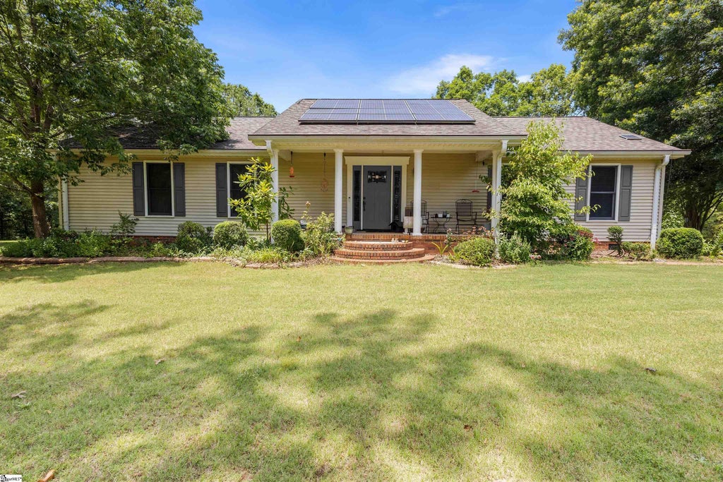 Nature lovers! See how you can afford the acreage you want, with an investment that supports a great lifestyle, beauty, and privacy. Two homes on property, including an established and furnished Airbnb, a pole barn which could house a boat, and a 50 ft cinderblock storage building and/or workshop. MAIN HOUSE: 1990's updated ranch, 2 spacious bedrooms, 2 full baths and walk-in closets, oversized living room/dining room combo with full brick wall fireplace and glass insert. Oak beams from (trees on the property) grace the cathedral ceiling and dental molding. The large eat-in kitchen has hand scraped teak plank flooring, stainless steel appliances, with architectural cabinetry and stone countertops. The flooring continues into the laundry room and pantry. The 16x10 sunroom overlooks an expanse of lawn and mature trees (white and red oak, pecan, flowering crepe myrtle in shades of rose, pink, and white, holly, magnolia, red maple, cherry, cedar, gardenia, hydrangea and dogwood), contributing to a shady retreat. There is also a grape arbor and mature blueberry bushes. Outside the covered front porch is an inviting solid front door is with beveled glass side lights in Clemson orange. 26 solar panels convey with the title, keeping the energy bills at $40-60/month. City water is $23 per month. Custom blinds throughout. Roof is 12 years old. The attached garage is wired for a door opener and has a storage room. TREEHOUSE: is custom designed with a bedroom, a sleeping loft, livingroom, dining area, fully equipped kitchen with stainless appliances, and granite countertops. Hardwood bamboo floors throughout. The main bath is European inspired design with a glass sink and shower, and heated towel rack. Upstairs is a powder room convenient for sleepers. Hookups for washer/dryer have been installed already. The wrap around deck is delightful to sit with a cup of coffee or glass of wine to watch visiting deer and wild turkey. It overlooks a new concrete fire pit. The "GATEHOUSE" has 4 sections for storing tractors and lawn equipment, gardening tools, a second double door for storing larger items, a large tiled room adequate for a pool table and an open garage area. This building has no plumbing but is electrified and has a phone line.