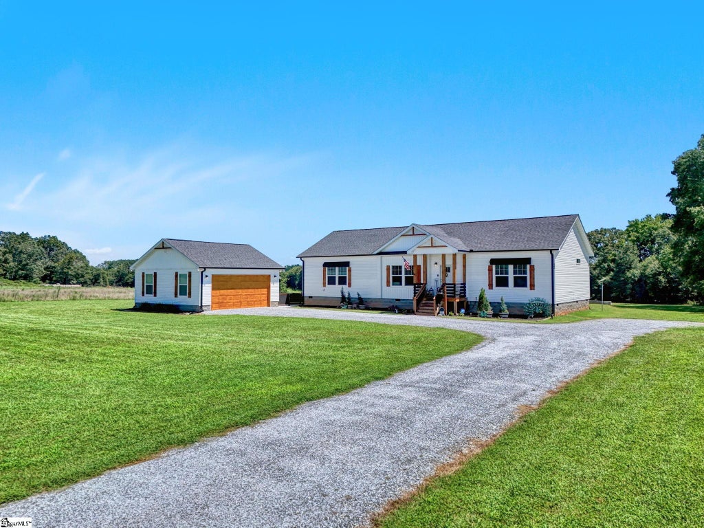 Modern comfort meets country charm with this 2024 modular home on 4 beautiful acres. Welcome to your serene country retreat! Built in 2024, this stunning modular home offers over 1900 square feet of thoughtfully designed living space, perfectly situated on 4 picturesque acres. Whether you're looking for peace, privacy, or room to entertain, this property delivers it all. Step inside the main home to find a bright and airy open floor plan, featuring neutral tones, modern wood accents, and plenty of natural light. The spacious living room flows seamlessly into the dining area and well-appointed kitchen, perfect for gatherings with friends. The kitchen boasts quartz countertops, a large center island with bar seating, stainless steel appliances, a walk-in pantry, and stylish finishes that will delight any home chef. The luxurious primary suite offers a private oasis with a spa-inspired ensuite bathroom, complete with double sinks, a walk-in shower, soaking tub, ample storage, and a generous walk-in closet. Two additional bedrooms, each with walk-in closets, share a full hallway bathroom. A large laundry room adds even more convenience with cabinets and a versatile countertop ideal for folding or prepping. Outside, the property truly shines. Relax or entertain on multiple covered patios and decks, or cool off in the above-ground pool while taking in the peaceful surroundings. The detached garage includes a 400 square foot private apartment featuring its own entrance, the fourth bedroom, full bathroom, and yard space. It is perfect for use as a rental, guest suite, or bonus living area. Located just minutes from Honea Path and Belton for everyday essentials, you're also only 20 minutes from Anderson’s hospitals, shopping, and restaurants, and just 40 minutes to Greenville or Easley. Best of all, no HOA means you can enjoy your space and lifestyle without restrictions. There is plenty of room for a mini farm and garden. Don’t miss this one-of-a-kind property! Schedule your private tour today, and experience the charm for yourself!