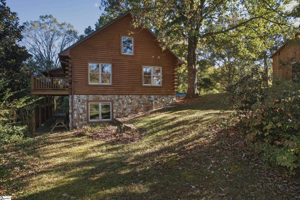 Tucked just outside the city limits of the quaint town of Landrum, this classic log home sits on 8.24 acres with seasonal mountain views, abundant road frontage, and fantastic potential. With 4 bedrooms, 3 full baths, and full basement, it’s a rare find for those seeking space, privacy, and room to bring a vision to life. Step inside to hardwood floors that run throughout the home. The main level offers a comfortable layout with a primary suite featuring an ensuite bath and walk-in closet, plus two secondary bedrooms and a full hall bath. Downstairs, a finished walkout basement (with interior access) expands your living options with a great flex room, a dedicated storage room, a full bath, and an extra-spacious bedroom—perfect for guests, multigenerational living, or a home office setup. Outside, horse lovers and hobby farmers will appreciate the 4-stall barn with a tack room, open pastures, and two large equipment bays. A deeded right-of-way off Owls Nest Road provides excellent access to the equipment bays and offers a convenient, flat exit when needed. With over 1,400 feet of road frontage along Highway 14, no restrictions, and no HOA, the property presents excellent possibilities—including potential subdividing along Highway 14 or Owls Nest Road. Property is being sold strictly "as-is, where-is." Bring your ideas and handyman know how—opportunities like this don’t come around often. Call today!